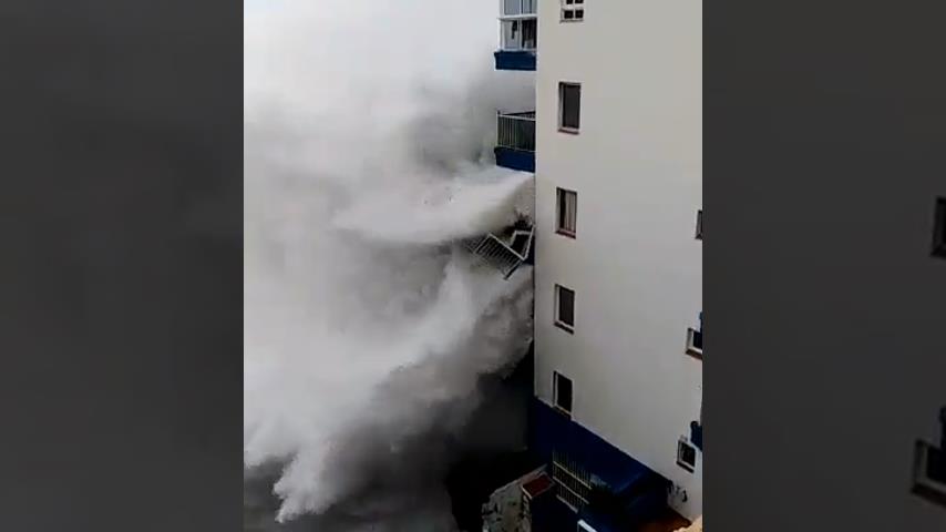 巨大的海浪在區域梅薩del Mar的特內里費 (加那利群島), 大風暴這個週末. 海浪達到驚人的高度,並在一棟公寓樓的摧毀許多陽台.