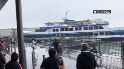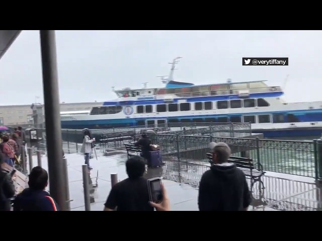 恐慌來襲圍觀的人,因為他們觀看了渡輪撞上在渡輪大廈在舊金山碼頭. 沒有人受傷,但船上被損壞.