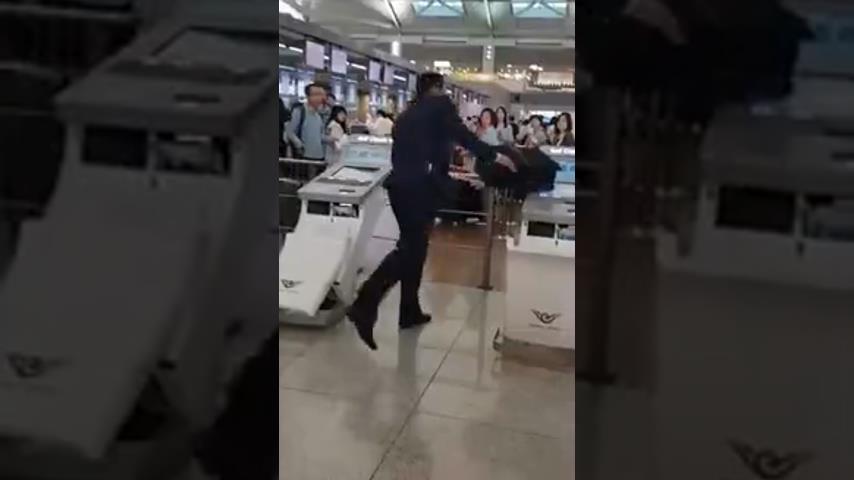 在韓國人錯過了他的一個包, 和煩惱開始在機場攻擊電子服務機.