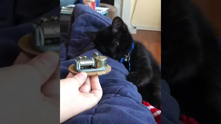 一個sakcharopetafros (袋鼯屬短頭蛙屬) 它使用一個有趣的技術來馴服一隻小貓. 小有袋動物跳到頭上...