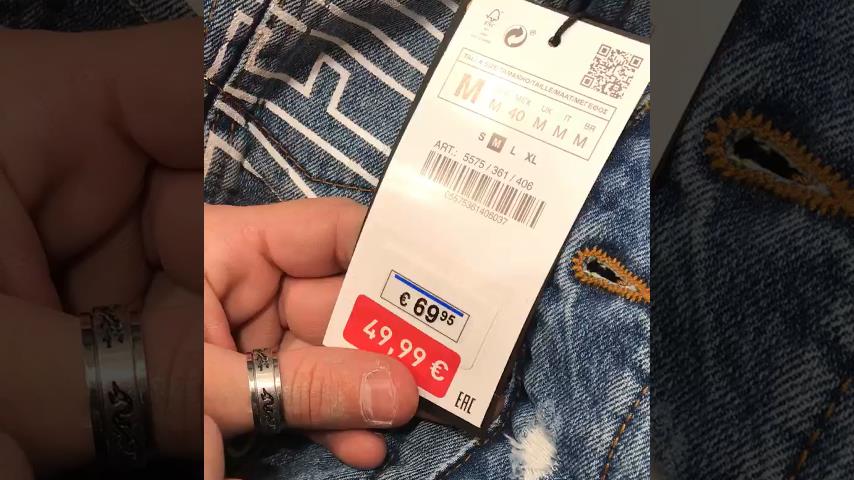 在一家服裝店Zara的安格雷法國, 一個人發現原來價格夾克 (39,95€) 它比折扣價小得多 (49,95€), 而假定原來標價要高得多 (69,95).