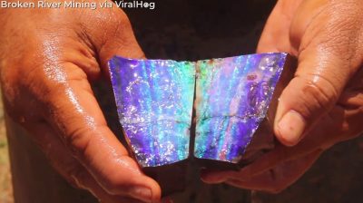 一名男子打開兩個蛋白石, 這是在澳大利亞昆士蘭州的一個礦中發現. 化石揭示了美麗的藍色和綠色的顏色.