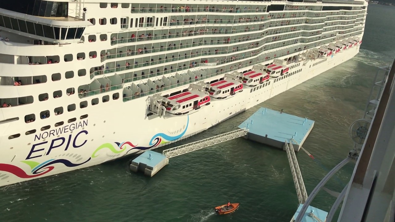 在聖胡安,波多黎各港2月12日, 當你接近港口,機械故障巨大的遊輪挪威史詩會出事. 該船將打兩個小系泊平台,將完全沉浸.