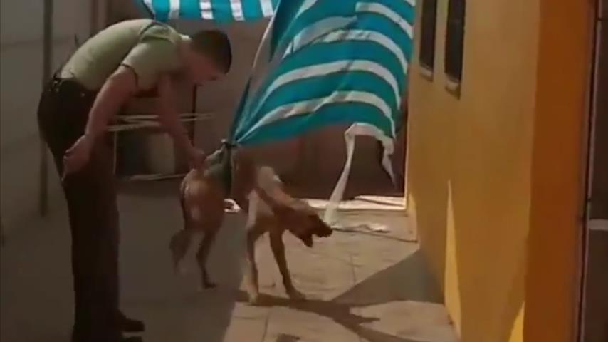在聖費利佩,智利, 警察幫助了一直糾纏在一個帳篷的面料狗. 業主失踪, 和狗獨自在陽台上. 鄰居報了警,當他們聽到喊狗. 軍官走到車的後備箱通過柵欄,走近受驚的狗幫助他. 使用刀, 他設法利用面料和釋放他的狗. 一旦釋放, 動物隨即趕到的民警討好.