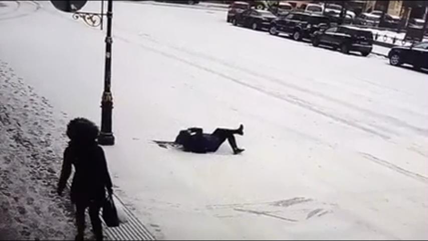 兩個人試圖幫助別人誰在雪地上滑倒, 但也會有相同的命運.