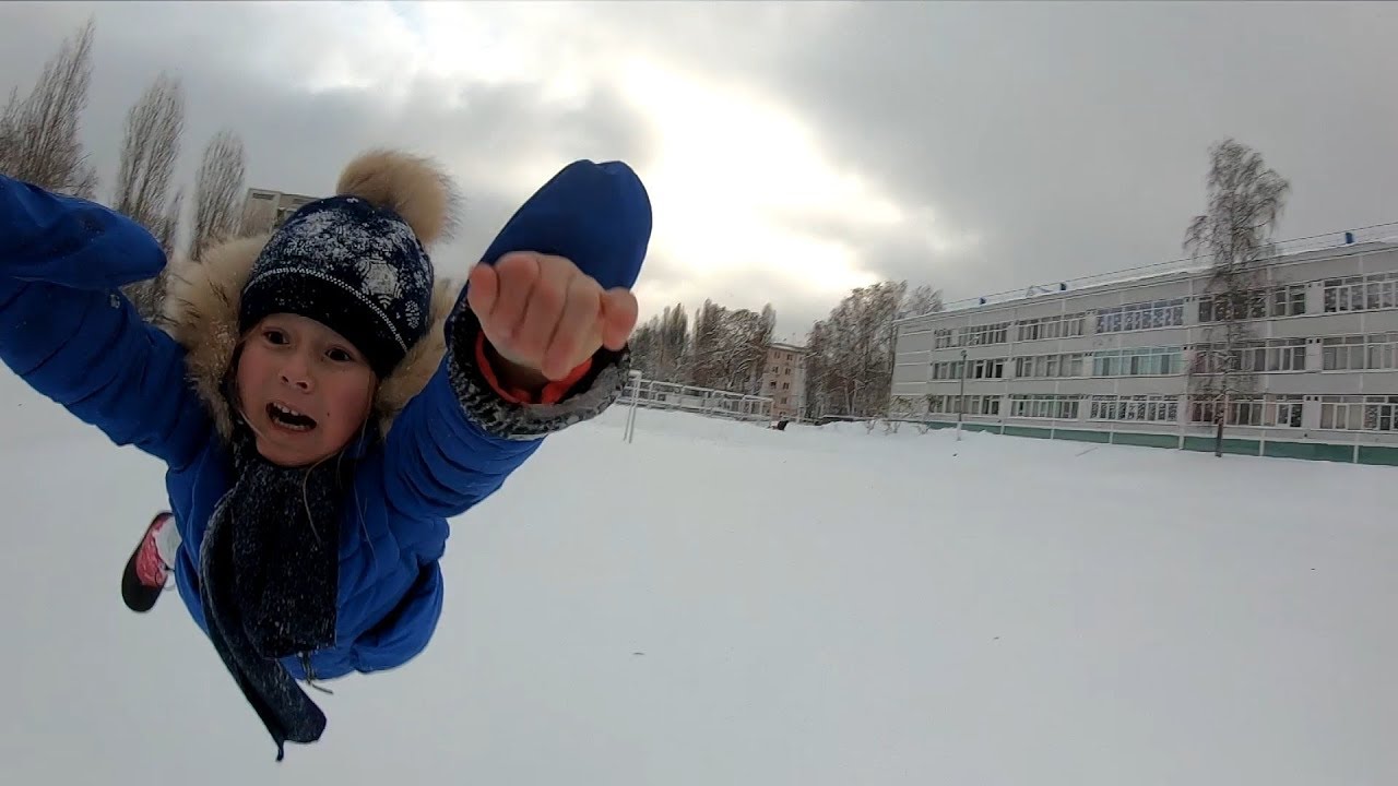 一個爸爸俄羅斯轉向空氣的小女兒逗樂, 而突然將在厚厚的積雪飛.