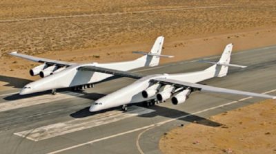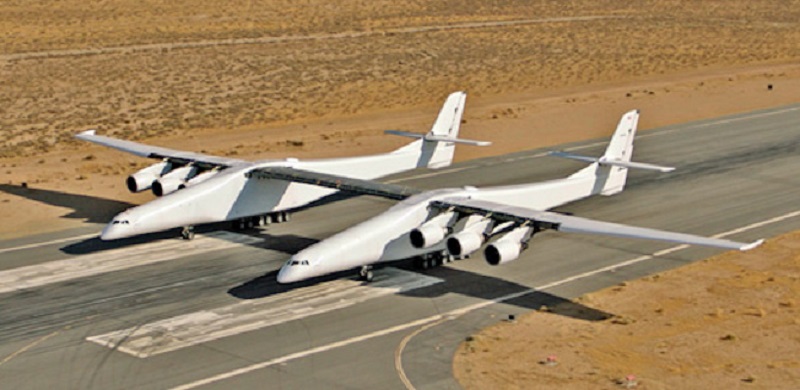 這是Stratolaunch, 在世界上最最大的飛機, 2019 年 4 月 13 日首飛. Stratolaunch 旨在將火箭從 11 高度發射到太空.000 措施 (即從平流層, 故名). 翼展117米,身長73米.
