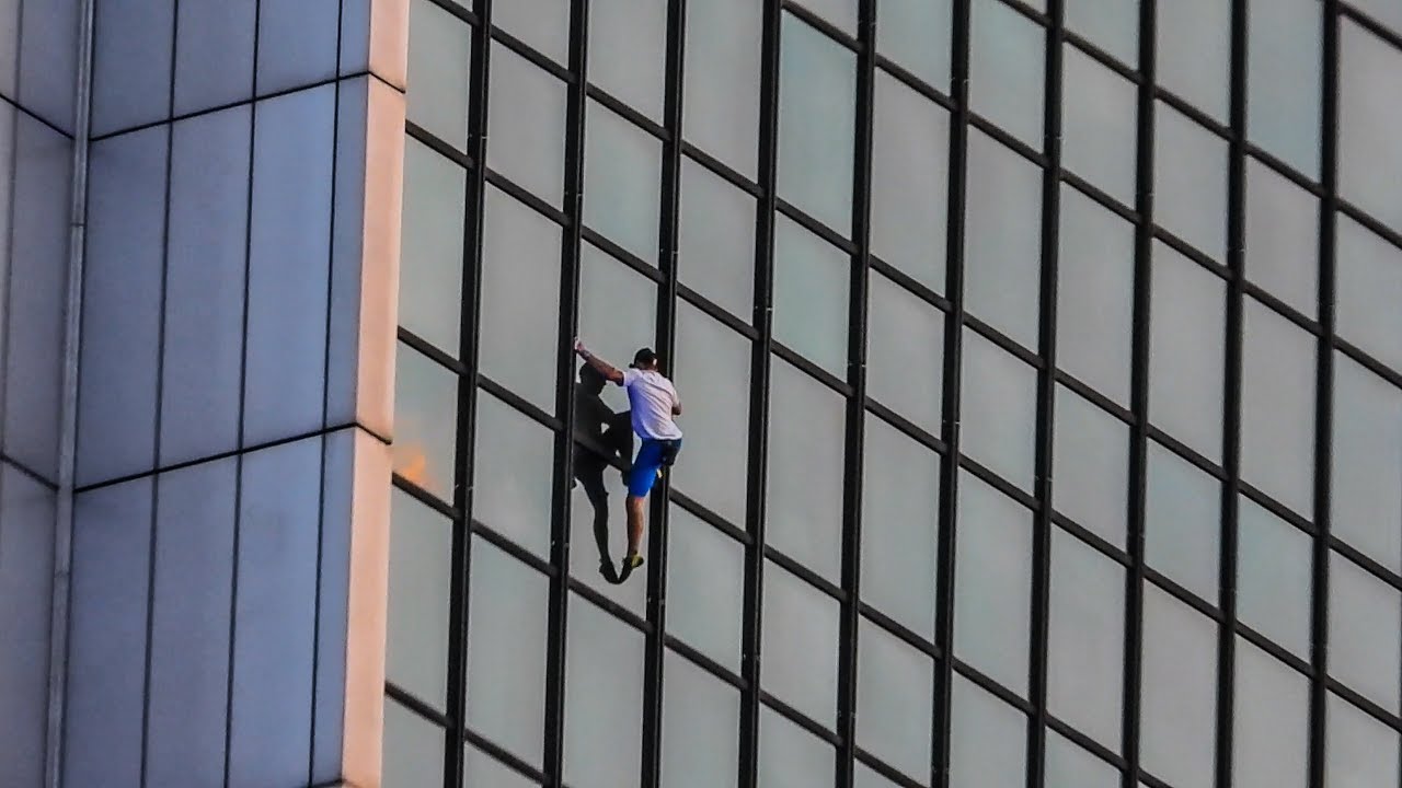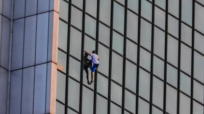 登山者馬爾辛Banot測試華沙市中心一個非常危險的風險: 無安全措施爬上萬豪酒店的頂層, 全國最高的建築之一,高170米.