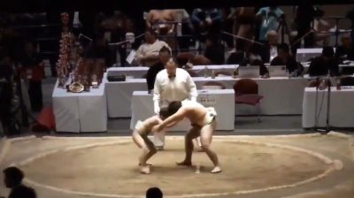 一個意外的結局年輕的相撲摔跤手之間的比賽. 該矮腳男孩會被證明是非常困難的對手就顯得.