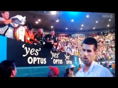 網球選手諾瓦克 · 德約科維奇扔向一個年輕女孩的三通, 和 sichameni mpoychesa 持久性有機污染物和抓住. 撞了人?