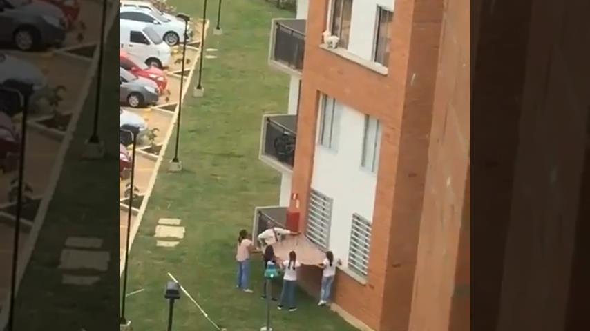 一群孩子和成人持片伸試圖挽救,似乎已經引起建築物的窗台狗. 鎮靜, 狗會觀察他們一段時間,從打開的窗口回自己的家.