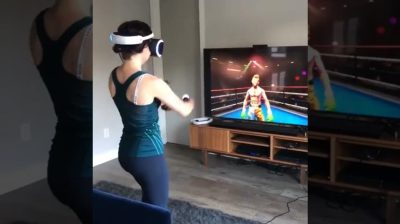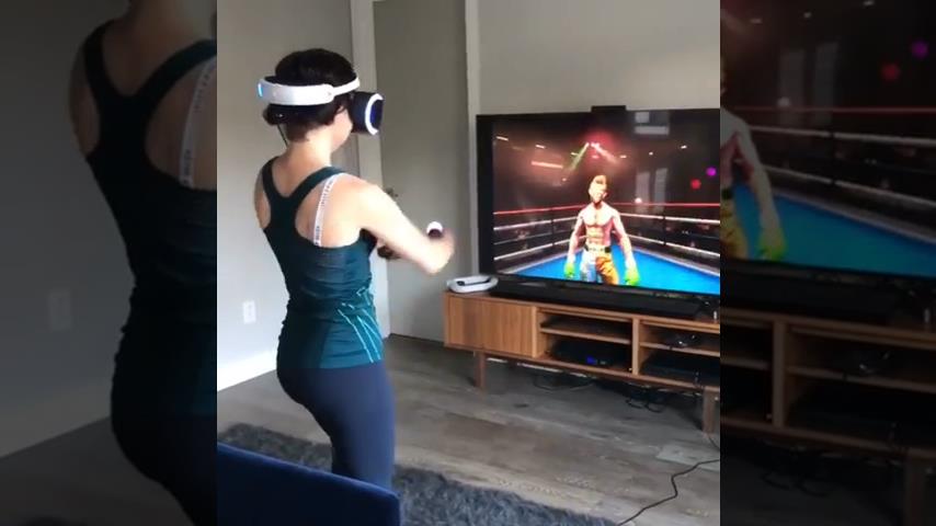 紐約的一名男子第一次嘗試用他的虛擬現實係統玩拳擊遊戲。.