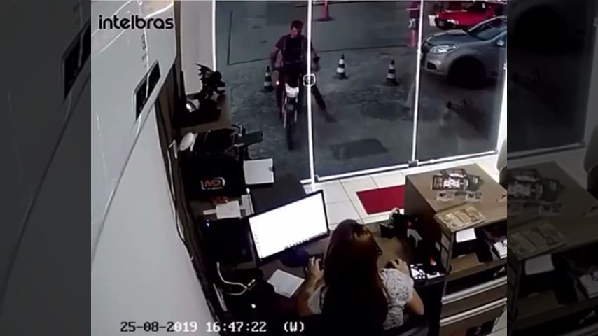 在巴西, 一個年輕人想在櫥窗前與他的摩托車女孩留下深刻的印象,他的工作. 嘗試做一個職業倦怠, 但我會扔整個玻璃前底部. 至少沒有向任何人聲張.