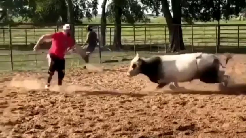 在一個農場, 一個人避免了多頭的攻擊, 但第二個牛市來從後面驚訝.