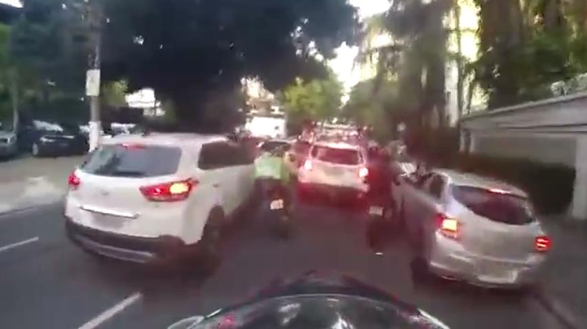 在聖保羅的巴西街頭警用摩托車和一名可疑男子之間的瘋狂追逐.