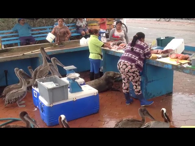 在常見的肉類市場在厄瓜多爾的加拉帕戈斯群島, 鵜鶘一群和等待廠商後面一段肉片的密封.