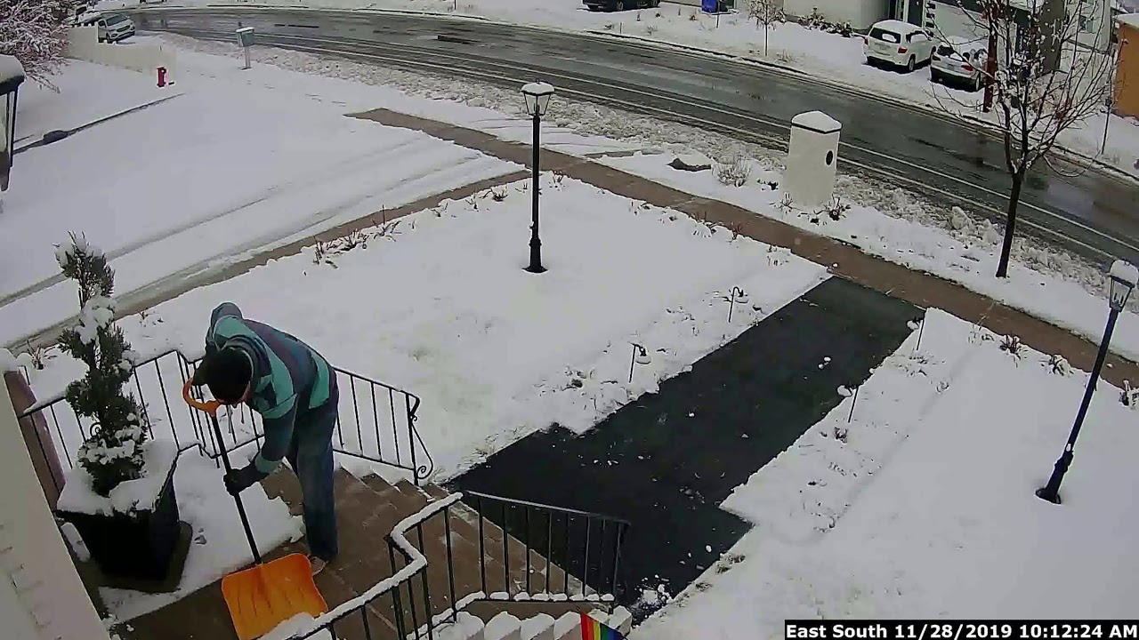 一名男子在自家門口清理積雪約10分鐘, 但掃雪機將迅速通過,將與雪道上再見面.