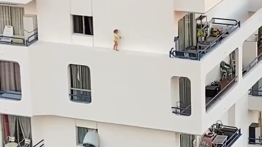 星期六2020年1月4日在特內里費島特內里費, 錄製視頻上孩子,她走在窗台上建築物的4樓. 小男孩在房子的陽台來到窗外, 而他的父母是在浴室. 可怕.