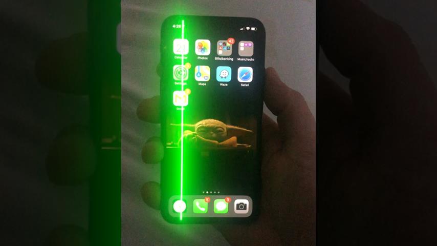 iPhone有一個屏幕破損, 和顯示器的邊緣具有綠垂直線. 它的主人發現天行者盧克是完美的壁紙拿著一個綠色的光劍, 太行現在好像有.