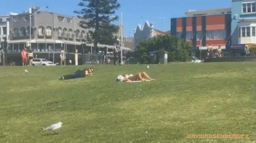 一名男子準備對一個女人日光浴一個邪惡的惡作劇在一個公園.