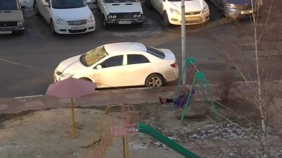 在俄羅斯別爾哥羅德, 一個使用長的繩子將他的孩子在鞦韆上, 從他的公寓在4樓的窗口.