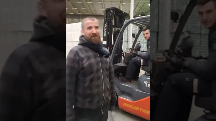 在荷蘭的衛生紙倉庫, 僱員使鏟車的車輪後面一坐向我們展示種群狀況. 我們可以看到,倉庫是全. 該名男子利用這個機會與誰擔心,衛生紙會耗盡人們的樂趣和擁擠的超市購買.