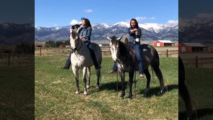 兩個女人騎著兩匹馬, 當其中一個打開一瓶香檳時. 被軟木塞的聲音嚇壞了, 馬開始奔跑,將騎手摔倒在地.