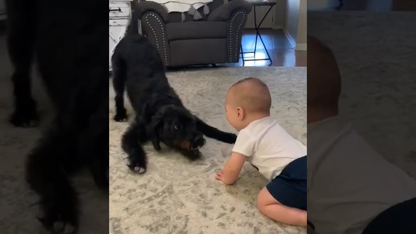 一個嬰兒正在和他的新朋友一起玩, 大聲笑.