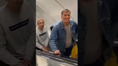 在手機上使用應用程序, 有人讓自動扶梯上的所有人微笑.