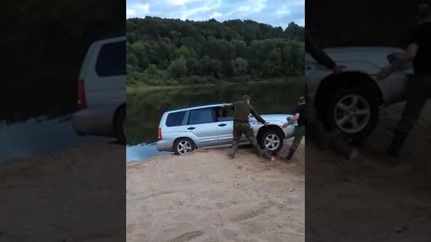 因為他們的吉普車被卡在河岸上, 三個男人盡力將其倒回水中之前. 最初他們會失敗, 但他們不會放下.