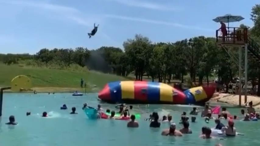 在德克薩斯州的漢堡湖, 一個人將從巨大的充氣床墊上跳下來, 扔一個小孩躺在另一頭.