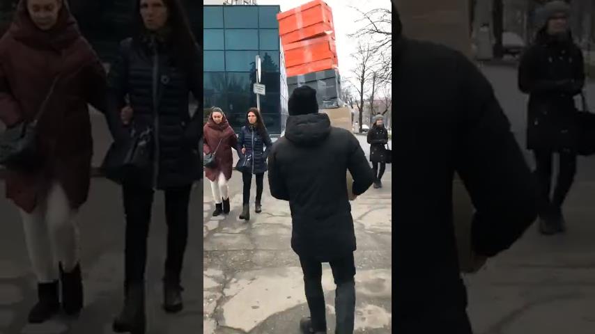 一名男子手持一疊箱子嘲笑路人, 在烏克蘭扎波羅熱的街道上. 所有盒子都用膠帶捆紮, 該男子欺騙了受害者,使他們相信自己會落在他們身上.