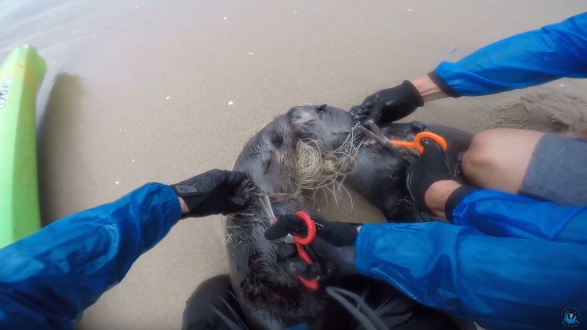 在非政府組織海洋保護納米比亞的這段視頻中 (OCN), 兩名男子在獨木舟上營救兩個年輕的海豹,他們用一條釣魚線綁在一起.