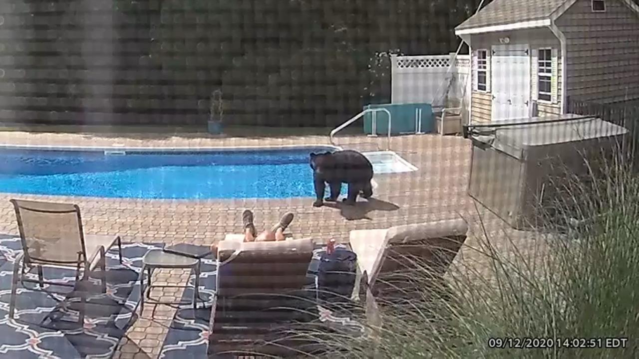 2020 年 9 月 12 日星期六,馬薩諸塞州格林菲爾德, 馬修·貝特(Matthew Bete)在游泳池旁的躺椅上睡覺, 當他從突然拜訪中醒來時. 一隻黑熊進入他的院子,在游泳池裡喝水, 然後好奇地接近馬修.