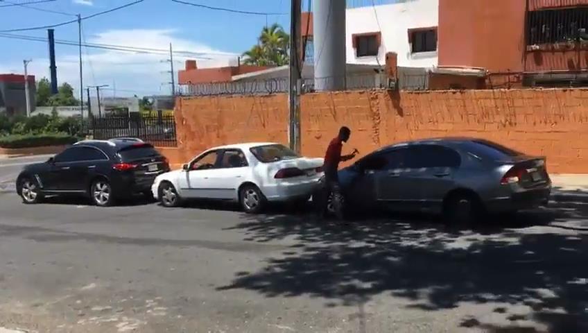兩輛車在多米尼加共和國聖多明各的道路上擋住了一輛白色汽車. 就在之前, 白色的汽車在離開現場之前撞到了其中一輛汽車。. 然後,他的駕駛員用錘子出來攻擊那些困住他的駕駛員. 其中一名操縱他的車輛,用錘子擊打駕駛員, 但最終在牆上. 然後,白色汽車的駕駛員設法逃脫.