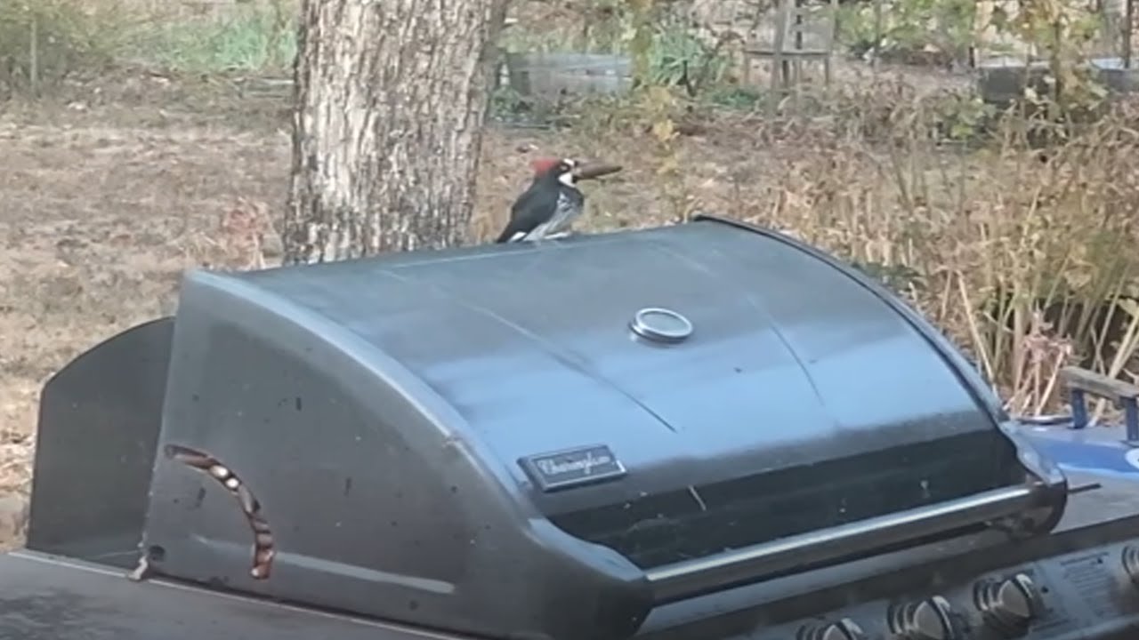 在鄉間別墅裡, 所有者發現胡桃夾子進入了燒烤爐,並隱藏了橡子。, 那隻鳥把烤架當作儲藏室.