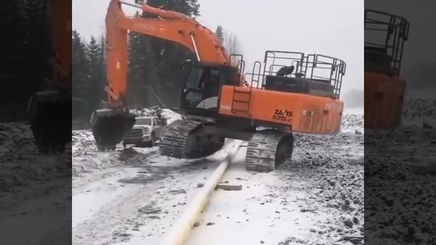 挖掘機操作員將他的重型車輛通過管道, 不碰它.