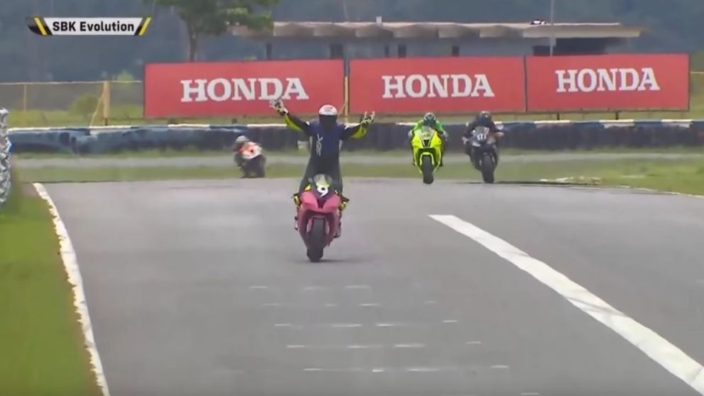 2020年12月20日,星期日,巴西戈亞尼亞, 巴西車手安德烈·韋里斯西莫(AndréVerissimo)在Ayrton Senna的超級摩托車比賽中爭分奪秒. 在最後一彎的出口處領先, 坐上摩托車,舉起雙手慶祝勝利, 但是在終點線之前被兩個對手超越.