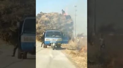 中國的一位農民拼命試圖保存秸稈,秸稈在超載的三輪車上開始燃燒. 但是火勢蔓延得很快, 這個人的努力是徒勞的.