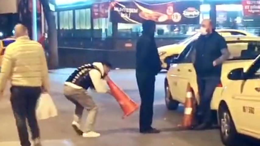 土耳其的一名男子接近數名路人,並用交通錐向他們咆哮, 用作放大器.