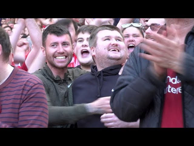 利物浦球迷趕緊拉笑著的一張照片, 當一個球員在對方隊員降臨的前面.