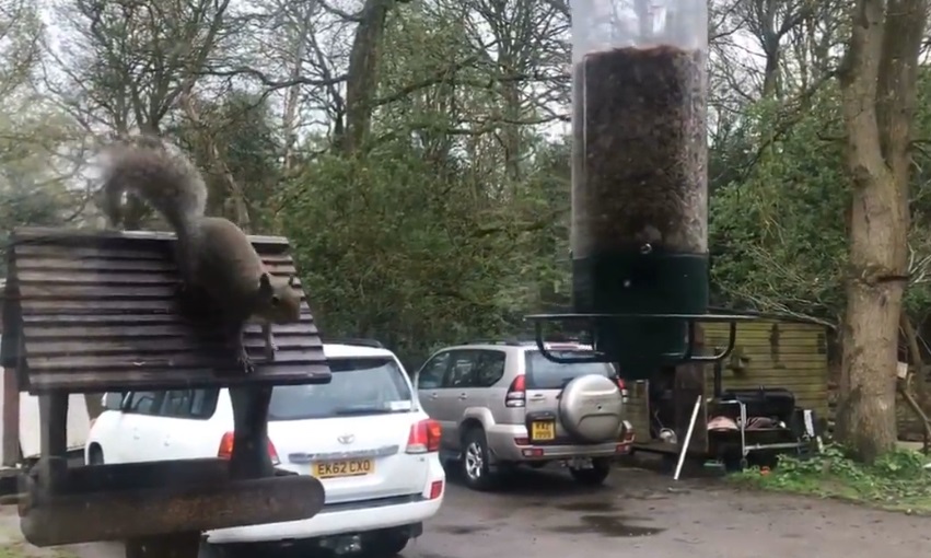餵鳥器是松鼠的誘人誘惑. 但是這個餵食器有一個防鬆鼠系統, 並在松鼠碰到它後開始旋轉.