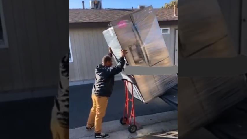 一個人設法從卡車上自己卸下一個相當大的冰箱, 並將其放在運輸車上.
