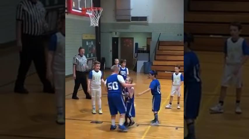 一個腦癱的小男孩得到隊友的幫助打了一個籃子.