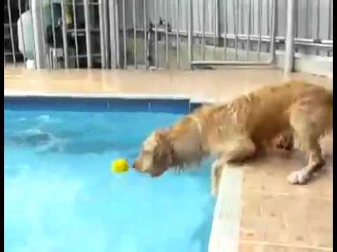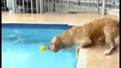 這只狗不想進入泳池, 於是他想到了一個巧妙的方法來取回球。.