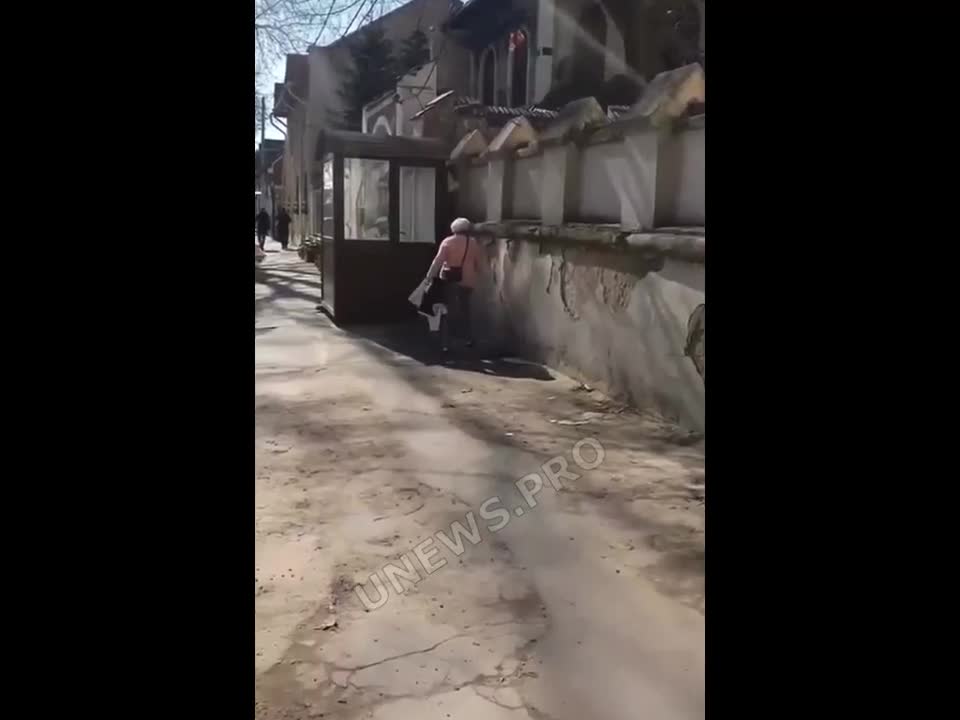 一個女人帶人行橫道, 揮舞著她的乳房.