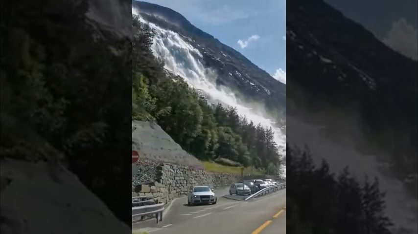 從一輛汽車經過郎佛森瀑布旁邊的橋上的壯麗景色, 在挪威霍達蘭.