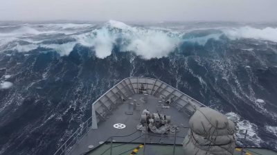 一艘新西蘭海軍艦艇在南大洋風速為 130 公里/小時的洶湧大海中, 南極洲附近. 在旅途中, 巨大的海浪擊中了船首.