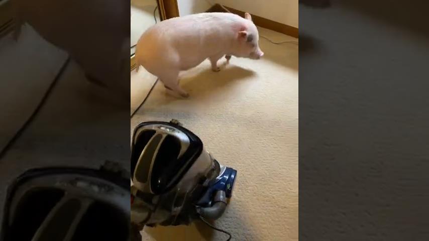 寵物豬的主人每次使用吸塵器都會惹惱他. 但他知道該怎麼做才能將其關閉.
