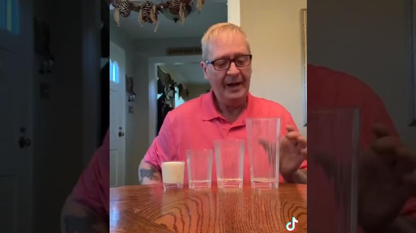 一個男人向我們展示了牛奶的“魔術”. 但是,小玻璃杯中的牛奶如何到達大玻璃杯,然後裝滿其他所有東西?; 第二和第三玻璃, 中間有個隔斷. 隔板的另一半裝滿了水 (如果你看第二個玻璃杯,它幾乎會顯示,直到它裝滿水). 所以第二杯只需要一半的牛奶就可以裝滿, 而在第三杯中加入第二杯的牛奶+水量. 最後一杯是滿的,因為它比第三杯窄. 然後倒入牛奶 (+ 水) 僅在第 2 和第 3 玻璃的半隔板中.